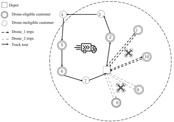 近年来,人工智能与传统运筹优化方法的结合已成为组合优化领域的重要研究方向,已有大量工作利用机器学习提升元启发式算法性能。本文提出一种面向多目标学习的混合启发式算法QSISRs,将强化学习中的Q-learning融入基于破坏-重建的元启发式框架中。本文聚焦于并行无人机调度旅行商问题(PDSTSP),该问题源于无人机参与城市末端配送的趋势,其中部分客户可由无人机从仓库直接独立服务,无需与卡车同步。