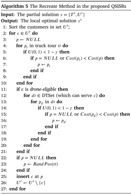PDSTSP建模为包含仓库与客户节点的有向完全图,配送资源包括一辆卡车和多架同质无人机。卡车可服务所有客户,而部分客户因距离或载重限制不能由无人机配送。无人机每次只能往返仓库为单个客户服务,卡车与无人机独立运行,无需同步。问题目标是最小化所有客户配送完成的最晚时间。SISRs(Slack Induction by String Removals)是一种基于破坏-重建的迭代局部搜索算法,通过反复移除与重新插入客户来改进解,其关键在于引入松弛量概念,包括容量松弛与空间松弛,移除客户可增加松弛,从而提高解改进的可能性。算法采用相邻字符串移除策略进行破坏,并在重建阶段使用带随机性的贪婪插入机制,以增强搜索效率与解质量。