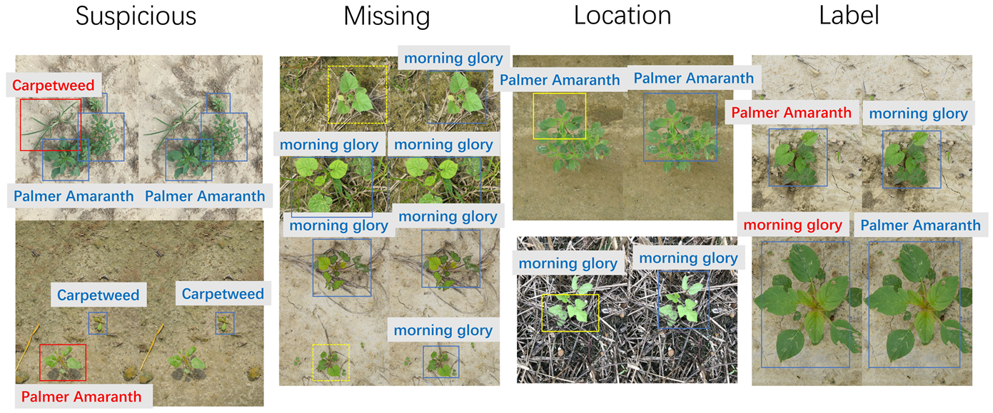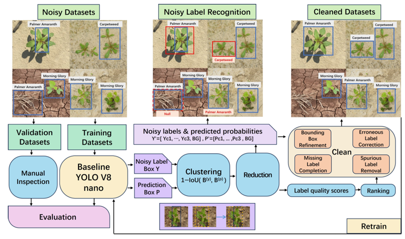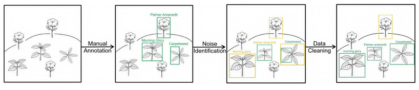 基于规则和人在回路的数据清洗方法利用领域知识、启发式规则和人工检查来校正标注错误。在农业目标检测中,这通常涉及验证遗漏目标、约束边界框几何形状以及有选择地重新标注模糊样本。例如,Li等人[20]提出了一个用于无人机影像的基于规则的杂草检测框架,利用植被结构先验过滤不可信的检测结果并指导手动校正。类似的大规模基准测试中也存在标注不一致和人为偏差问题[12,28]。虽然精确,但这些方法劳动密集,难以扩展,并且依赖专家知识,限制了其普适性。