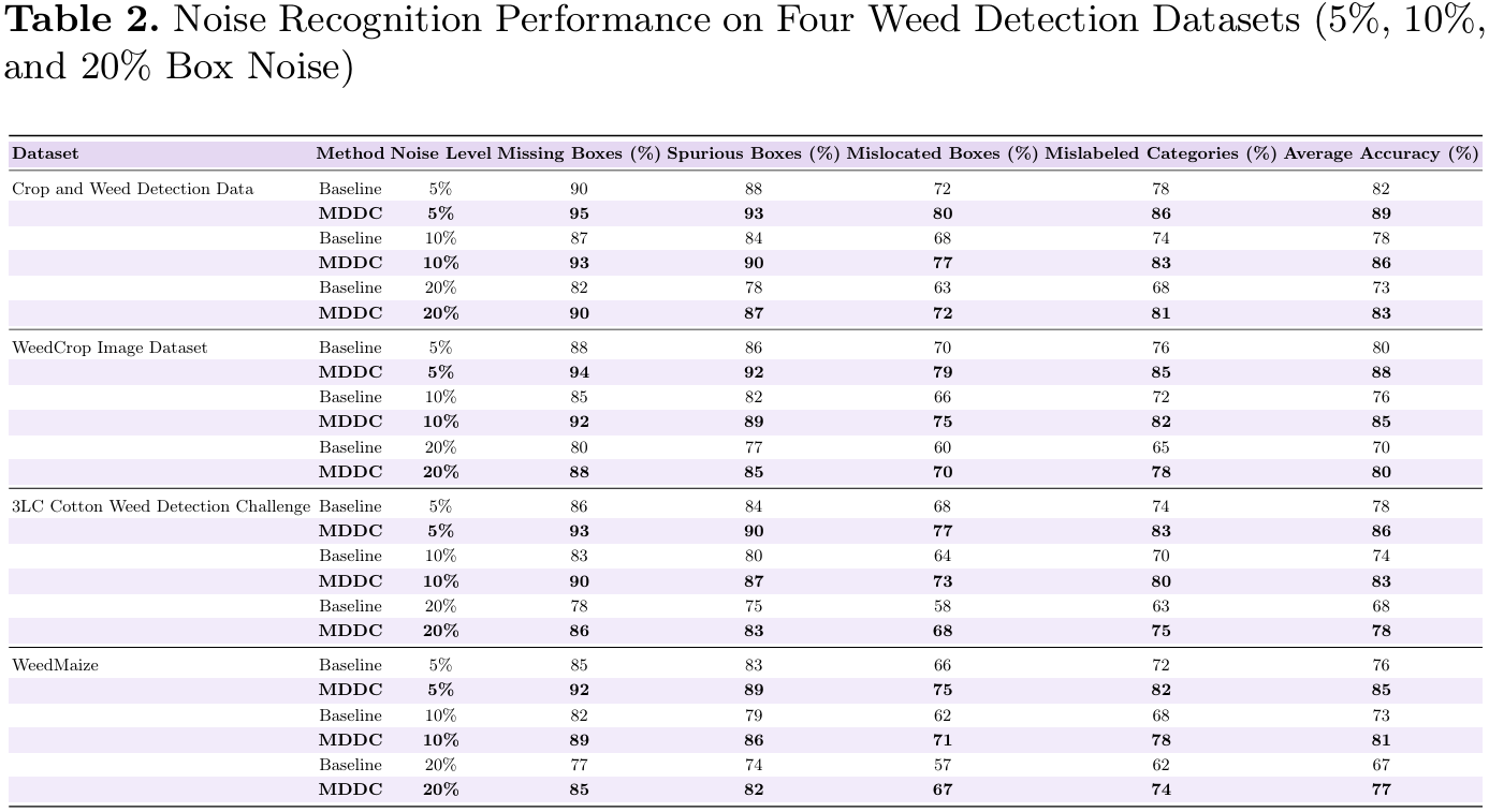 第一个实验评估了所提出的MDDC框架在四个农业目标检测数据集上,在5%、10%和20%受控标注噪声水平下的鲁棒性。如表2所示,MDDC在所有噪声水平和所有数据集上都持续优于基线。在低噪声(5%)下,MDDC将平均检测精度提高了大约6-8个百分点,这主要由对缺失和多余标注的有效校正驱动,其识别性能通常超过90%。在中等噪声水平10%下,性能差距进一步扩大,MDDC通过可靠地识别错标类别并部分缓解定位错误,实现了比基线高7-9个点的精度。当噪声水平上升到20%时,两种方法的整体性能都下降;然而,MDDC仍保持明显优势,实现了比基线高10-12个百分点的精度。这些结果表明,所提出的框架在现实的标注噪声条件下有效提升了数据质量和模型鲁棒性,并且在不同农业数据集上具有良好的泛化能力。
