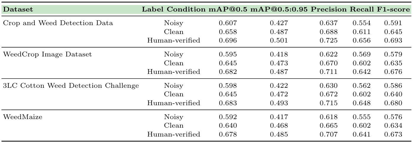 表3. 不同标签条件下四个杂草检测数据集的检测性能