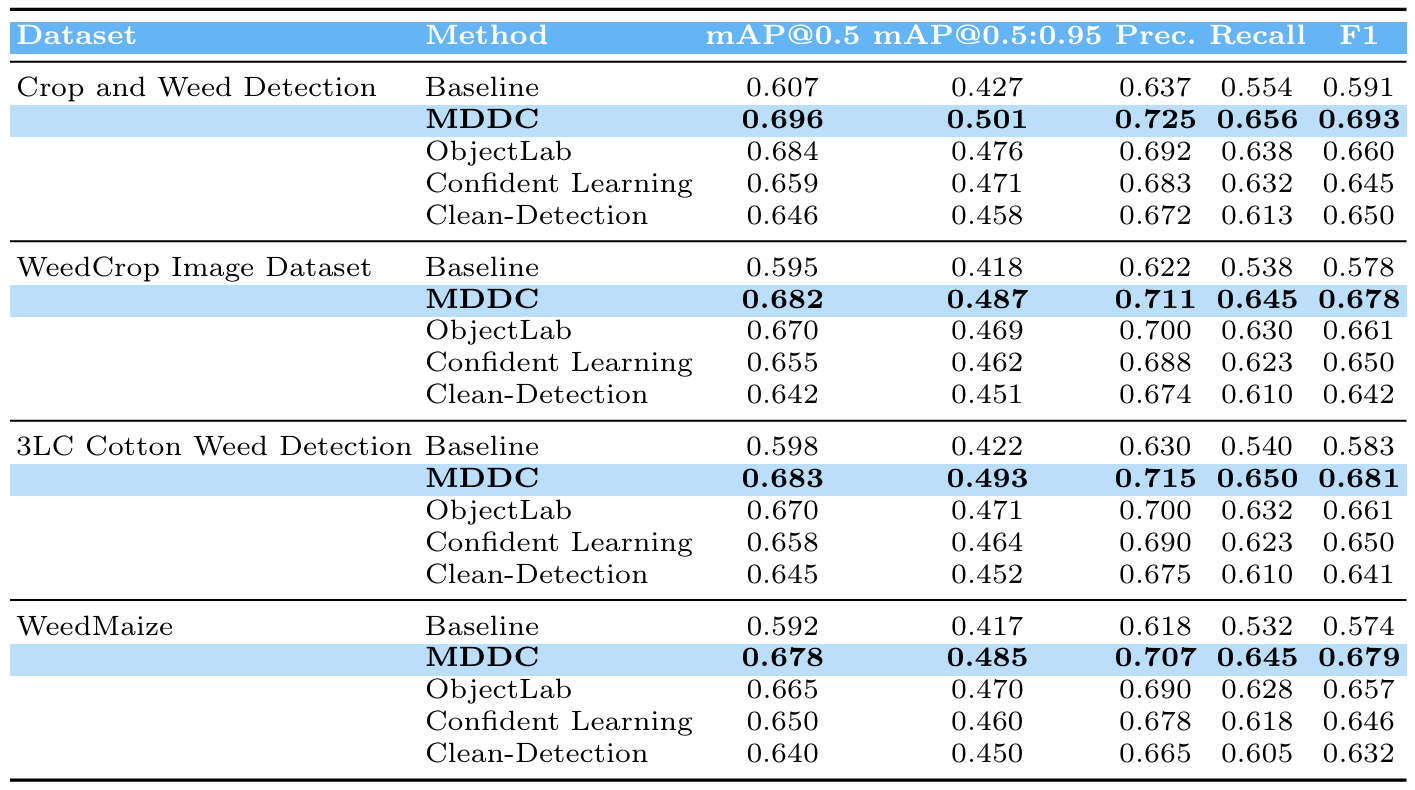 表4总结了结果。在所有数据集上,MDDC在mAP@0.5方面持续优于其他方法,相比基线和替代方法实现了5-25%的提升。该框架在mAP@0.5:0.95方面也显示出优越性能,表明了对具有挑战性或模糊目标具有更精确的定位和更稳健的处理能力。精确率和召回率同时得到提升,导致更高的F1分数,这突显了MDDC对于现实世界杂草检测任务的实用优势。
