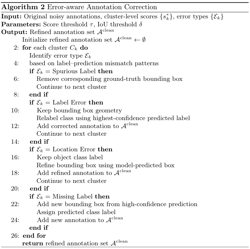 自动校正技术,例如两步的类别无关框校正和随后的标签调整[21],使用模型预测来更新噪声标注。伪边界框替换定位不佳的真实标注框,类别标签根据模型共识进行校正,低置信度的更改可选择由人工验证。师生框架利用教师模型的伪标签迭代优化数据集。Chachula等人[9]提出了目标检测置信学习算法,该算法自动识别缺失、多余、错标和定位错误的边界框,以提升标签质量。
