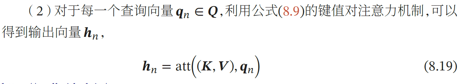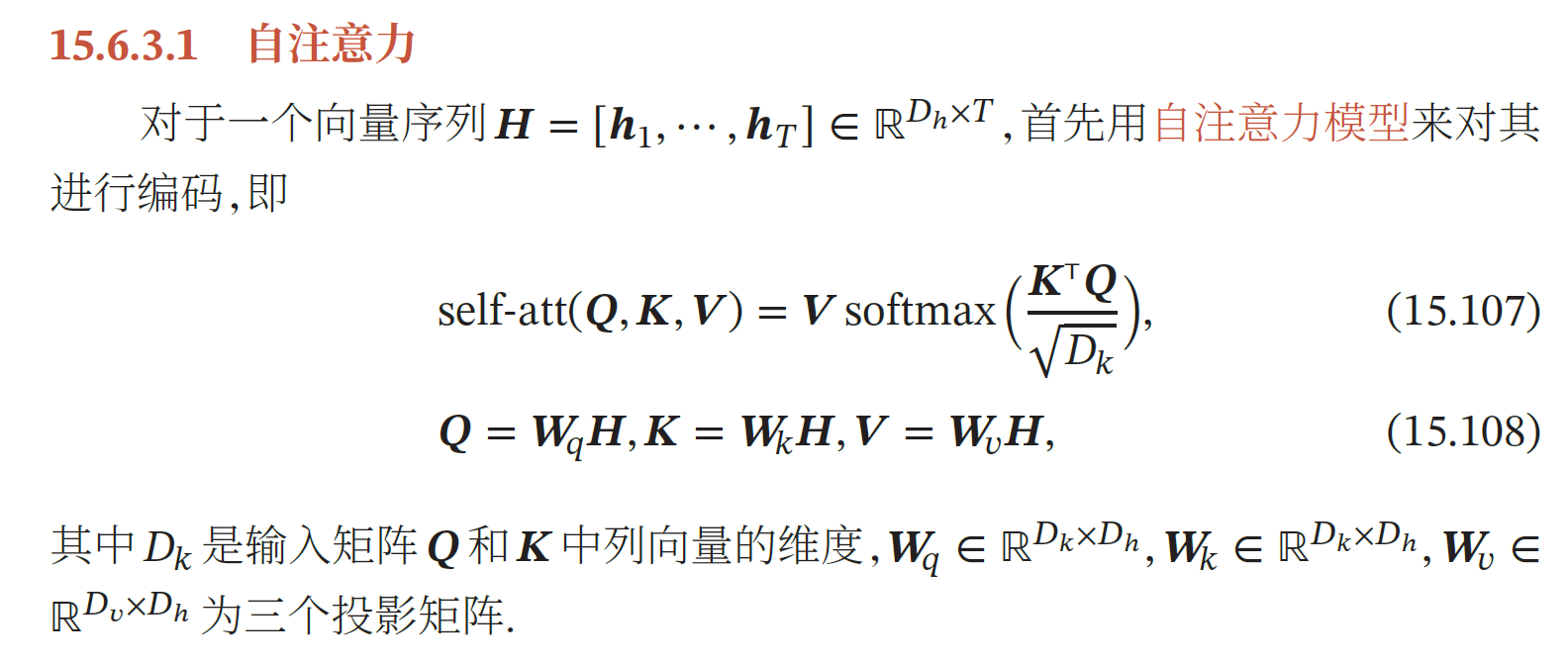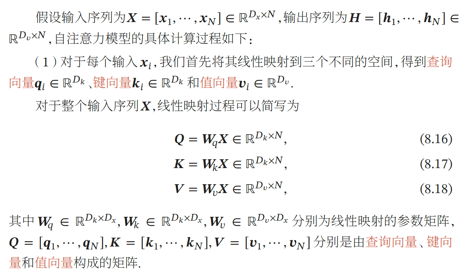 为了提高模型能力,自注意力模型经常采用查询-键-值**(Query-Key-Value,QKV)**模式,其计算过程如图8.4所示,其中红色字母表示矩阵的维度.