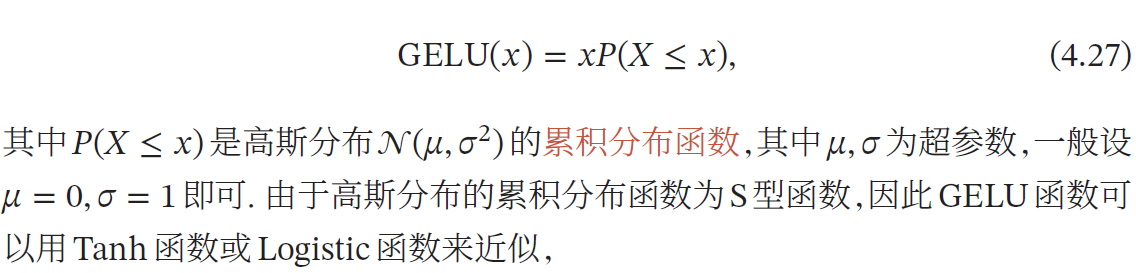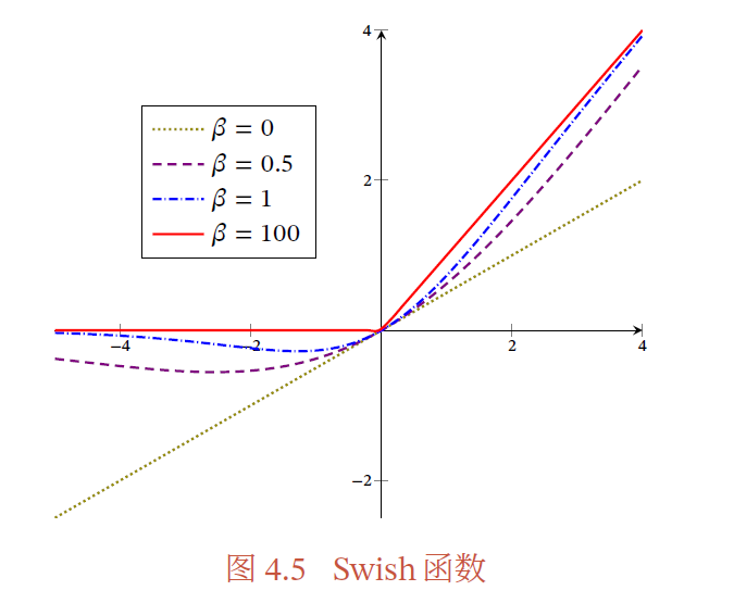 其中𝜎(⋅) 为Logistic 函数,𝛽 为可学习的参数或一个固定超参数.𝜎(⋅) ∈ (0, 1) 可以看作一种软性的门控机制.当𝜎(𝛽𝑥) 接近于1 时,门处于"开"状态,激活函数的输出近似于𝑥 本身;当𝜎(𝛽𝑥) 接近于0 时,门的状态为"关",激活函数的输出近似于0.