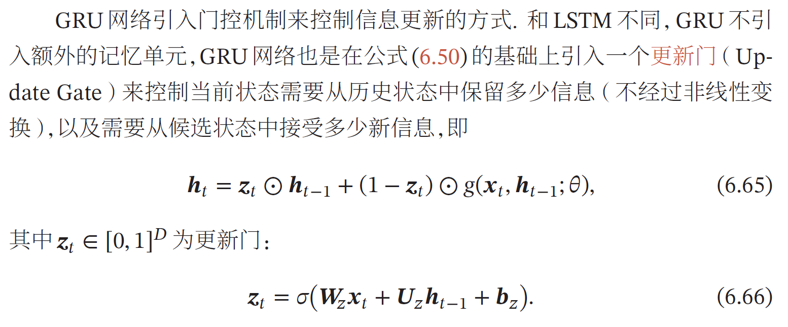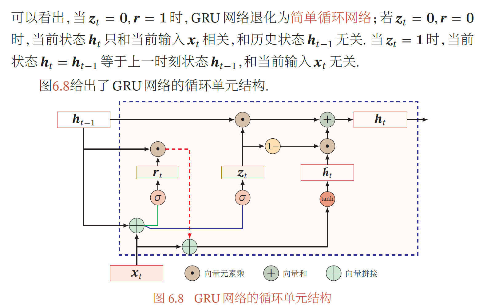 当𝒓𝑡 = 0时,候选状态𝒉𝑡̃ = tanh(𝑾𝑐𝒙𝑡 + 𝒃)只和当前输入𝒙𝑡相关,和历史状态无关.当𝒓𝑡 = 1时,候选状态𝒉𝑡̃ = tanh(𝑾ℎ𝒙𝑡 + 𝑼ℎ𝒉𝑡−1 + 𝒃ℎ)和当前输入𝒙𝑡 以及历史状态𝒉𝑡−1 相关,和简单循环网络一致.