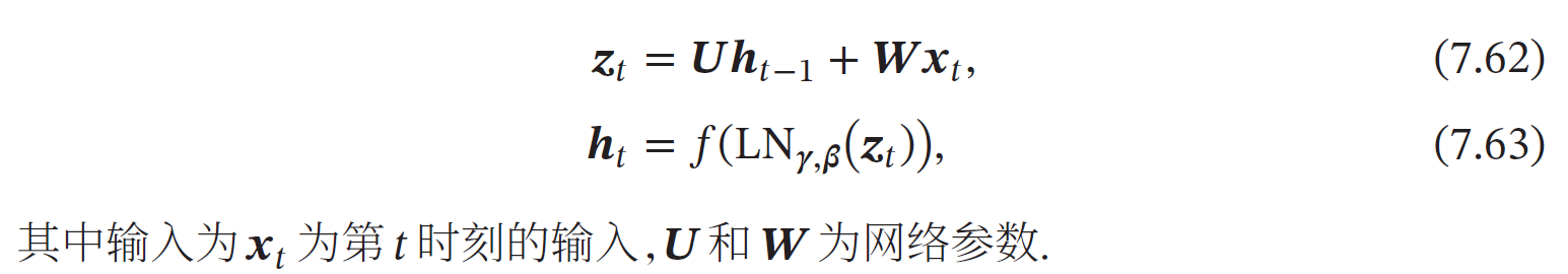 层归一化可以应用在循环神经网络中,对循环神经层进行归一化操作.假设在时刻𝑡,循环神经网络的隐藏层为𝒉𝑡,其层归一化的更新为