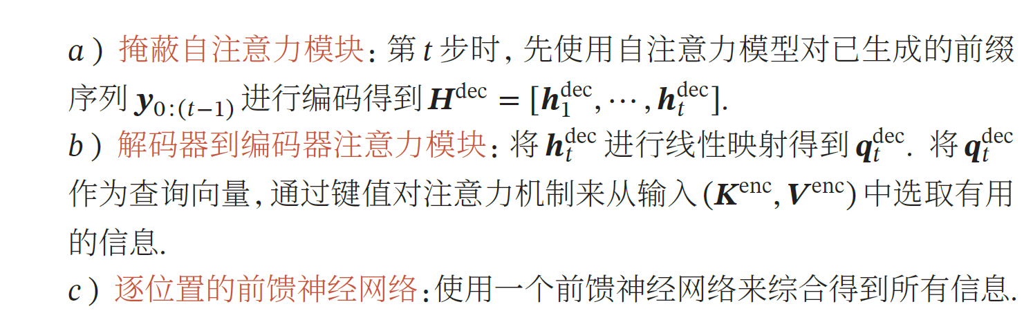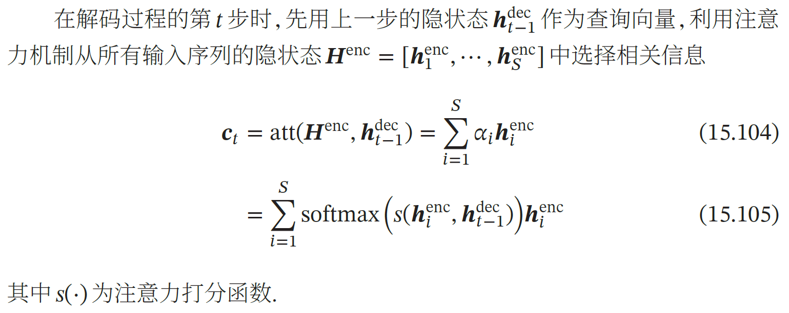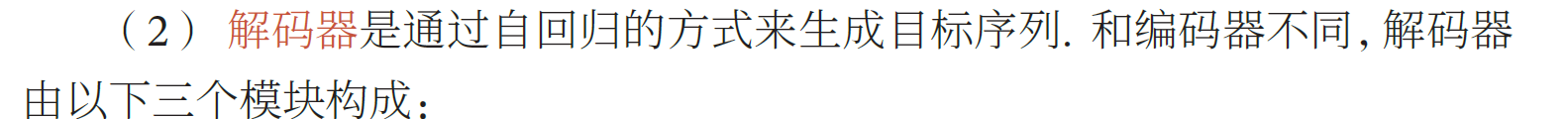 解码器:在生成目标序列时,使用另外一个循环神经网络𝑓dec 来进行解码.在解码过程的第𝑡 步时,已生成前缀序列为𝒚1∶(𝑡−1)
