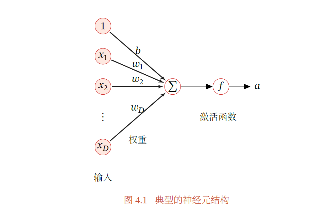 1943 年,心理学家McCulloch 和数学家Pitts 根据生物神经元的结构,提出了一种非常简单的神经元模型,MP 神经元[McCulloch et al., 1943].现代神经网络中的神经元和MP 神经元的结构并无太多变化.不同的是,MP 神经元中的激活函数𝑓 为0 或1 的阶跃函数,而现代神经元中的激活函数通常要求是连续可导的函数.