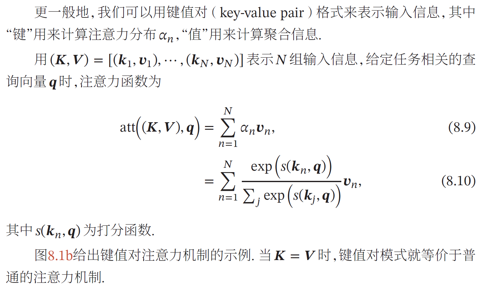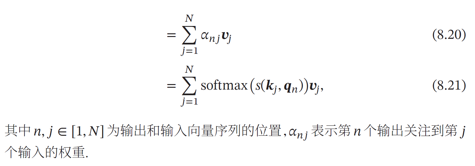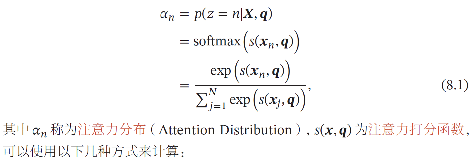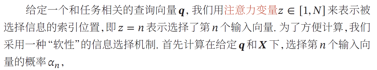 注意力分布𝛼𝑛 可以解释为在给定任务相关的查询𝒒 时,第𝑛 个输入向量受关注的程度.我们采用一种"软性"的信息选择机制对输入信息进行汇总,即
