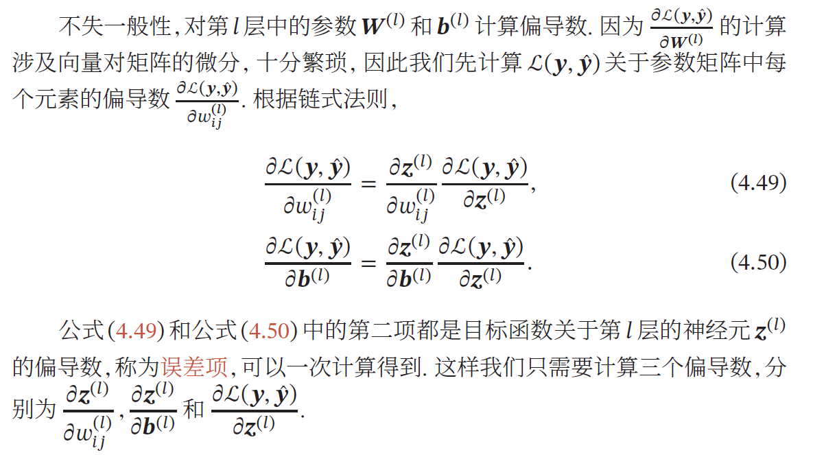 假设采用随机梯度下降进行神经网络参数学习,给定一个样本(𝒙, 𝒚),将其输入到神经网络模型中,得到网络输出为𝒚̂.假设损失函数为ℒ(𝒚, 𝒚̂),要进行参数学习就需要计算损失函数关于每个参数的导数.