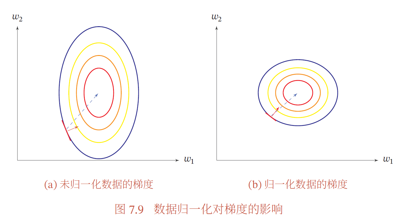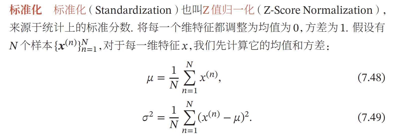利用第7.4节中介绍的数据预处理方法对𝒛(𝑙) 进行归一化,相当于每一层都进行一次数据预处理,从而加速收敛速度.但是逐层归一化需要在中间层进行操作,要求效率比较高,因此复杂度比较高的白化方法就不太合适.为了提高归一化效率,一般使用标准化将净输入𝒛(𝑙) 的每一维都归一到标准正态分布.
