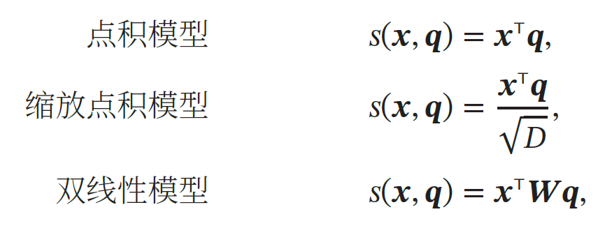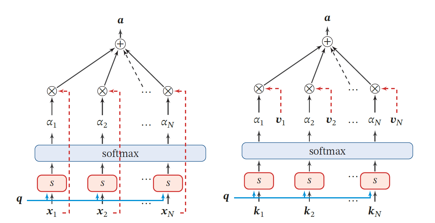 **注意力分布:**为了从𝑁 个输入向量[𝒙1, ⋯ , 𝒙𝑁 ] 中选择出和某个特定任务相关的信息,我们需要引入一个和任务相关的表示,称为查询向量(Query Vector),并通过一个打分函数来计算每个输入向量和查询向量之间的相关性.