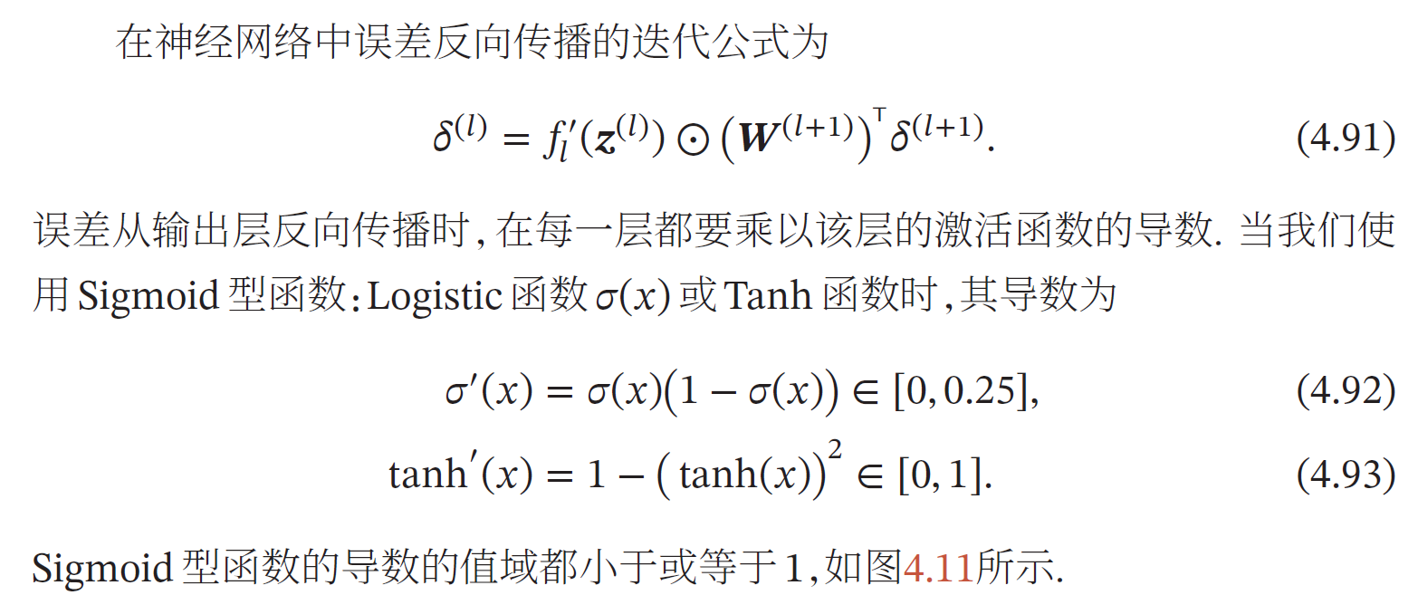 由于Sigmoid 型函数的饱和性,饱和区的导数更是接近于0.这样,误差经过每一层传递都会不断衰减.当网络层数很深时,梯度就会不停衰减,甚至消失,使得整个网络很难训练.这就是所谓的梯度消失问题
