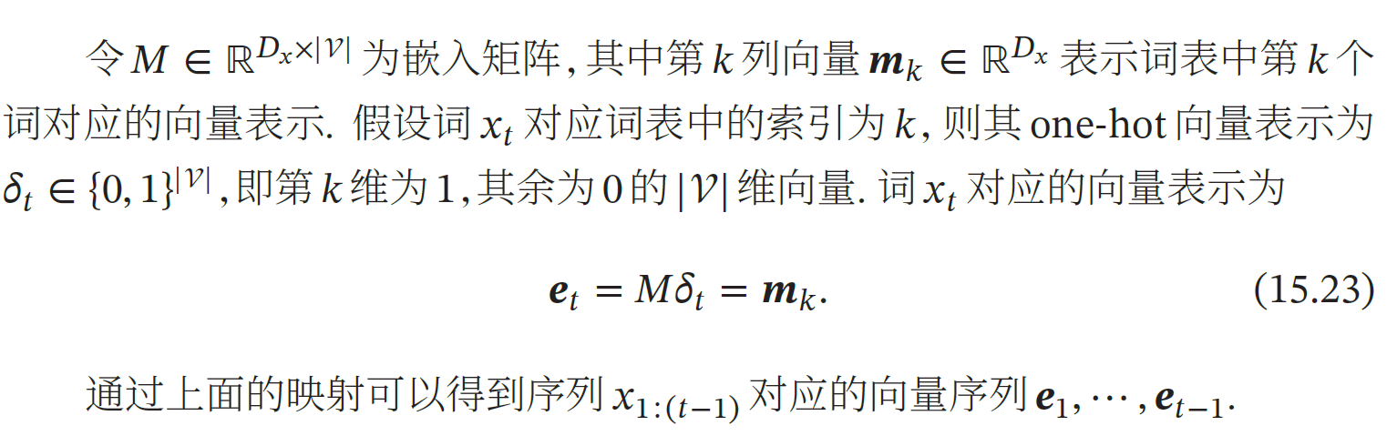 令ℎ𝑡̃ = 𝒙1∶(𝑡−1) 表示输入的历史信息,一般为符号序列.由于神经网络模型一般要求输入形式为实数向量,因此为了使得神经网络模型能处理符号数据,需要将这些符号转换为向量形式.一种简单的转换方法是通过一个嵌入表(Embedding Lookup Table)来将每个符号直接映射成向量表示.嵌入表也称为嵌入矩阵或查询表.图15.2是嵌入矩阵的示例