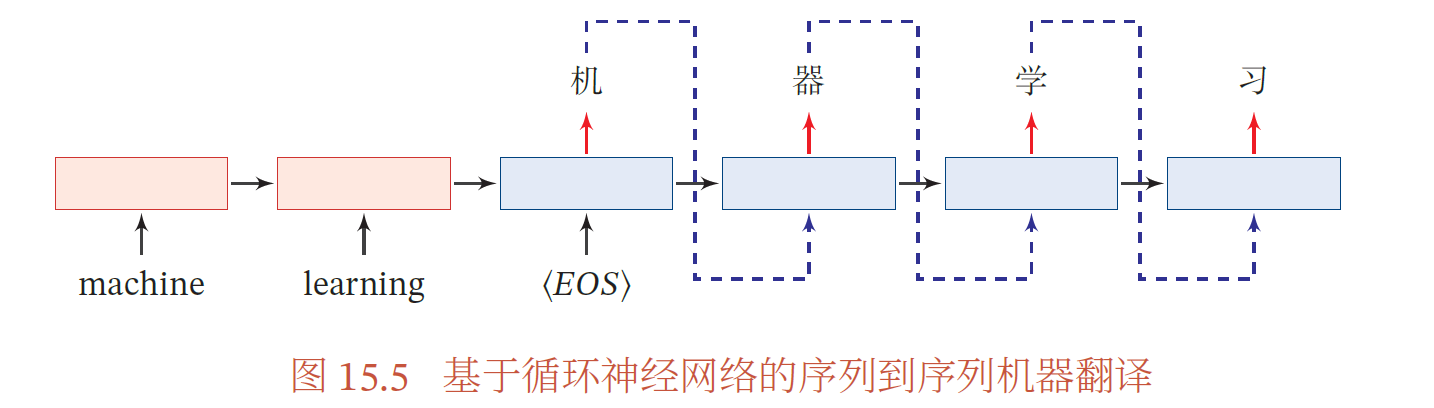 .比如在机器翻译中,输入为源语言,输出为目标语言.图15.5给出了基于循环神经网络的序列到序列机器翻译示例,其中⟨𝐸𝑂𝑆⟩ 表示输入序列的结束,虚线表示用上一步的输出作为下一步的输入.