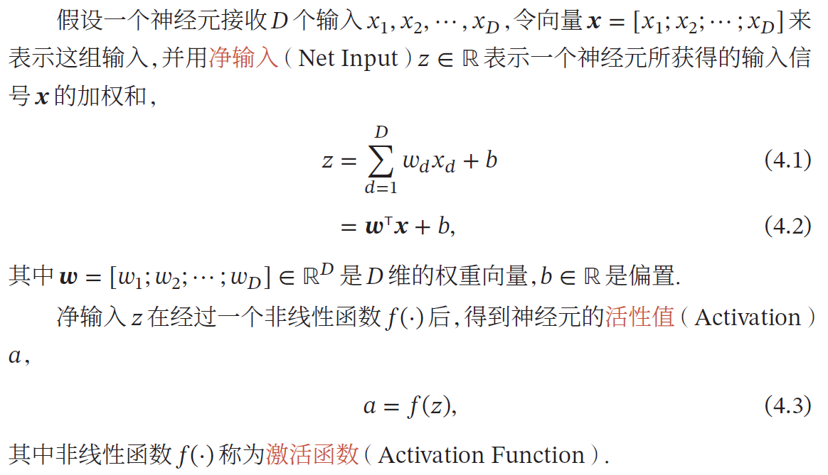 是一种分段线性函数,Sigmoid 型函数、ReLU 等激活函数的输入是神经元的净输入𝑧,是一个标量.而Maxout 单元的输入是上一层神经元的全部原始输出,是一个向量𝒙 = [𝑥1; 𝑥2; ⋯ ; 𝑥𝐷].