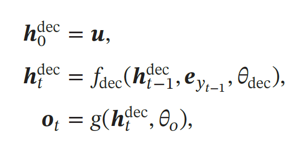 其中𝑓dec(⋅) 为解码循环神经网络,𝑔(⋅) 为最后一层为Softmax 函数的前馈神经网络,𝜃dec 和𝜃𝑜 为网络参数,𝒆𝑦 为𝑦 的词向量,𝑦0 为一个特殊符号,比如⟨𝐸𝑂𝑆⟩.