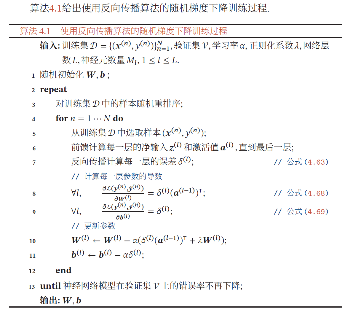 在计算出每一层的误差项之后,我们就可以得到每一层参数的梯度.因此,使用误差反向传播算法的前馈神经网络训练过程可以分为以下三步: