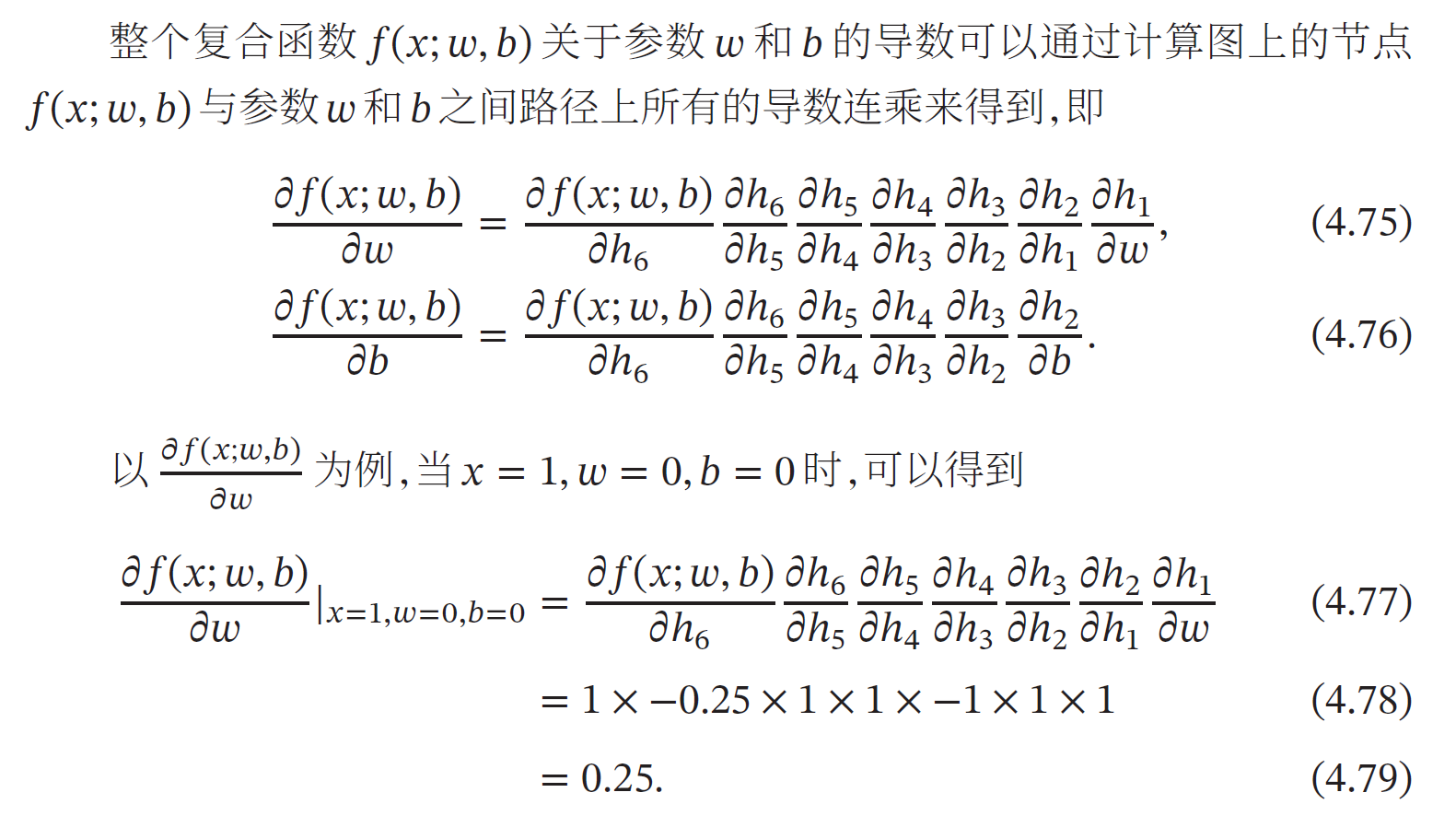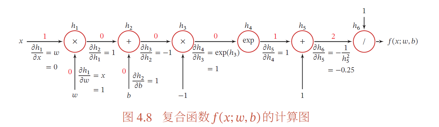 从计算图上可以看出,复合函数𝑓(𝑥; 𝑤, 𝑏) 由6 个基本函数ℎ𝑖, 1 ≤ 𝑖 ≤ 6 组成,每个基本函数的导数都十分简单,可以通过规则来实现.