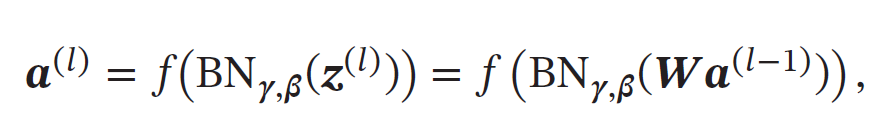 其中因为批量归一化本身具有平移变换,所以仿射变换𝑾𝒂(𝑙−1) 不再需要偏置参数。