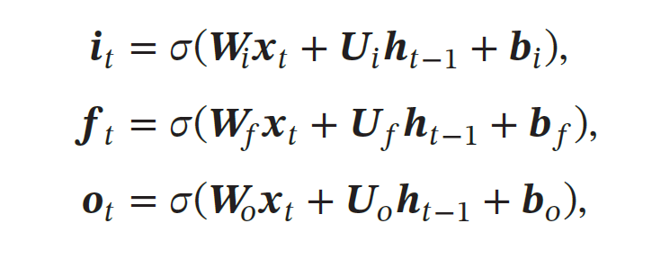 LSTM 网络中的"门"是一种"软"门,取值在(0, 1) 之间,表示以一定的比例允许信息通过.三个门的计算方式为: