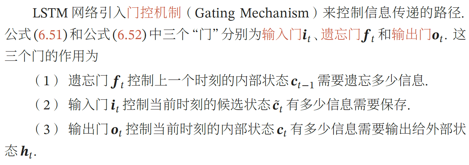 当𝒇𝑡 = 0, 𝒊𝑡 = 1时,记忆单元将历史信息清空,并将候选状态向量𝒄𝑡̃ 写入.但此时记忆单元𝒄𝑡 依然和上一时刻的历史信息相关.当𝒇𝑡 = 1, 𝒊𝑡 = 0 时,记忆单元将复制上一时刻的内容,不写入新的信息.