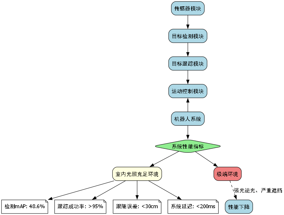 从表中可以看出,系统在不同场景下均表现出良好的性能,但在低光照和恶劣天气条件下,性能有所下降。这表明系统在复杂环境下的鲁棒性还有提升空间。在实际应用中,我们可以通过针对性的数据增强、模型优化和算法改进,提高系统在复杂环境下的性能表现。例如,针对低光照环境,可以引入红外成像技术或增强低光照图像处理算法;针对恶劣天气条件,可以结合多传感器信息,提高系统的环境感知能力。这种持续优化和改进的过程,将不断提高机器人追踪系统的性能和可靠性,使其能够适应更广泛的应用场景。