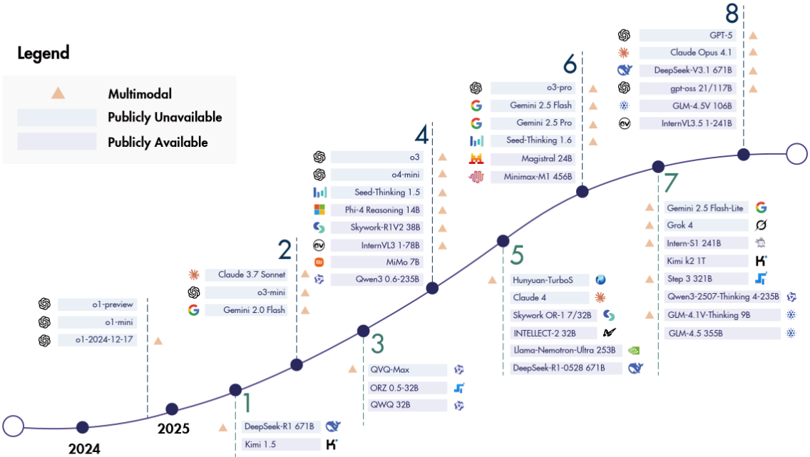 通过这种设计,GRPO既保留了PPO在线探索的能力(适合推理任务),又享受了类似DPO的低资源消耗,成为DeepSeek-R1等推理模型背后的关键技术。下图所示的时间线展现了使用强化学习训练的代表性推理模型的发展。这一过程囊括了各类开源与闭源的语言模型、多模态模型以及智能体模型。其中,OpenAI o1与DeepSeek-R1作为推理模型领域的关键里程碑,有力证明了可验证奖励训练的重要性。通过这种训练,模型得以掌握包括规划、反思及自我纠错在内的长链推理能力。