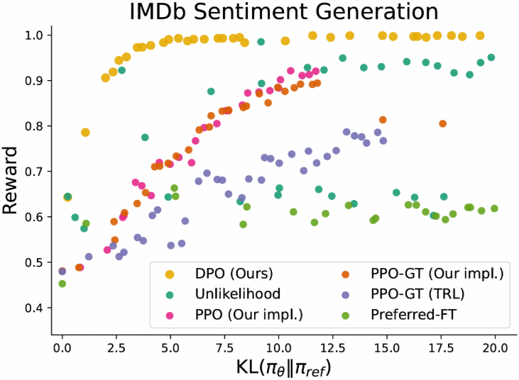 如下图所示,该图展示了在IMDb情感生成任务中,不同偏好学习算法的Reward-KL效率前沿。DPO(黄色散点)在所有KL散度值上都获得了最高的期望奖励,表明DPO能够更有效地在最大化奖励和与参考模型的KL散度约束之间进行权衡,其优化效果优于PPO等基线方法。