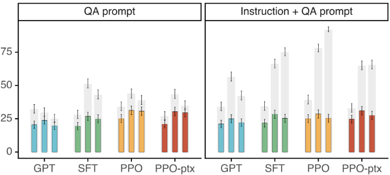以InstructGPT为例,RLHF带来了显著且复杂的影响。下图展示了模型在TruthfulQA基准上的真实性表现。其中,灰色柱表示"真实性(truthfulness)",彩色柱表示"真实性与信息量(truthfulness and informativeness)"。整体来看,经过RLHF的InstructGPT模型(PPO-ptx/PPO)在TruthfulQA上比较GPT-3基线更真实且更具信息量。但需注意,原论文报告1.3B的PPO-ptx模型在TruthfulQA上略低于同尺寸GPT-3。