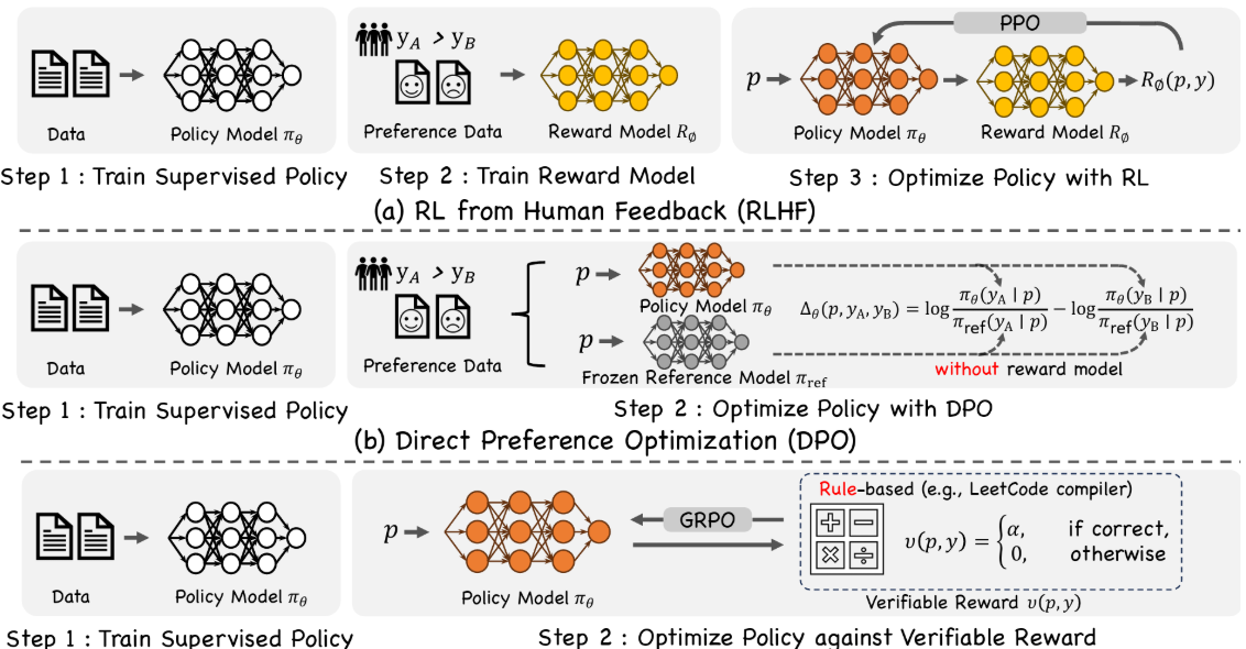 如下图所示,不同的对齐范式在流程设计上有所侧重。经典的RLHF范式依赖奖励模型和PPO进行在线优化;DPO直接基于偏好数据进行离线优化;而RLVR则利用确定性的验证器(如代码执行器)结合GRPO进行训练
