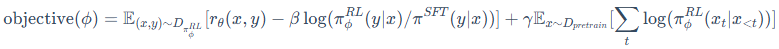 但研究者发现,单纯用PPO优化奖励模型,可能会导致模型在某些传统NLP任务(如SQuAD)上的性能下降,这种现象称为"对齐税"(Alignment Tax)。为了解决这个问题,InstructGPT提出了一种名为PPO-ptx的变体,它在优化奖励的同时,混合了一部分预训练数据的梯度,其优化目标为: