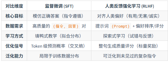 下表总结了SFT与RLHF在核心理念与实现方式上的关键差异: