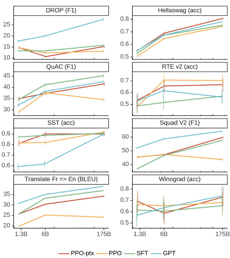 通过下图可以看到PPO-ptx缓解了RLHF在部分公开NLP数据集上的性能下降(对齐税)问题。图中PPO-ptx模型(红色)代表混合了预训练梯度,而PPO模型(橙色)则没有。在SQuADv2、DROP等多个任务上,PPO-ptx的性能显著优于单纯的PPO。