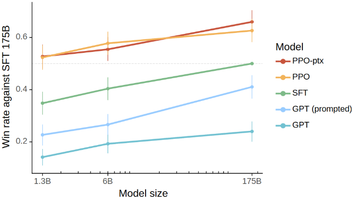 如下图所示,RLHF的有效性在实践中得到了强有力的验证。在InstructGPT的研究中,经过RLHF对齐后,仅有13亿参数的模型,在人类评估中的表现甚至超过了1750亿参数的原始GPT-3模型。这说明,让模型"懂"人类偏好,比单纯增加参数规模更能提升其实用性。
