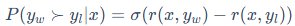 训练RM的目标是,让它给人类偏好的回答打出更高的分数。这通常基于Bradley-Terry模型,该模型假设人类对两个回答的偏好概率可以用它们的潜在奖励分数通过Sigmoid函数来建模: