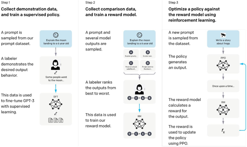 如下图所示,RLHF的流程主要包含三个核心步骤。首先通过有监督微调得到初始化策略模型;然后,收集人类偏好数据训练一个奖励模型;最后,使用奖励模型作为信号,通过强化学习算法(如PPO)进一步优化策略模型。