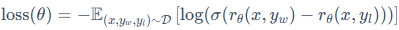 比更受偏好的回答,σ是Sigmoid函数。这个损失函数旨在最大化偏好回答与非偏好回答之间的分数差距。