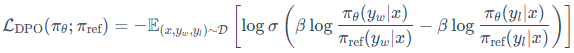是参考模型(通常是SFT模型),σ是Sigmoid函数。这个损失函数简洁地鼓励模型提高