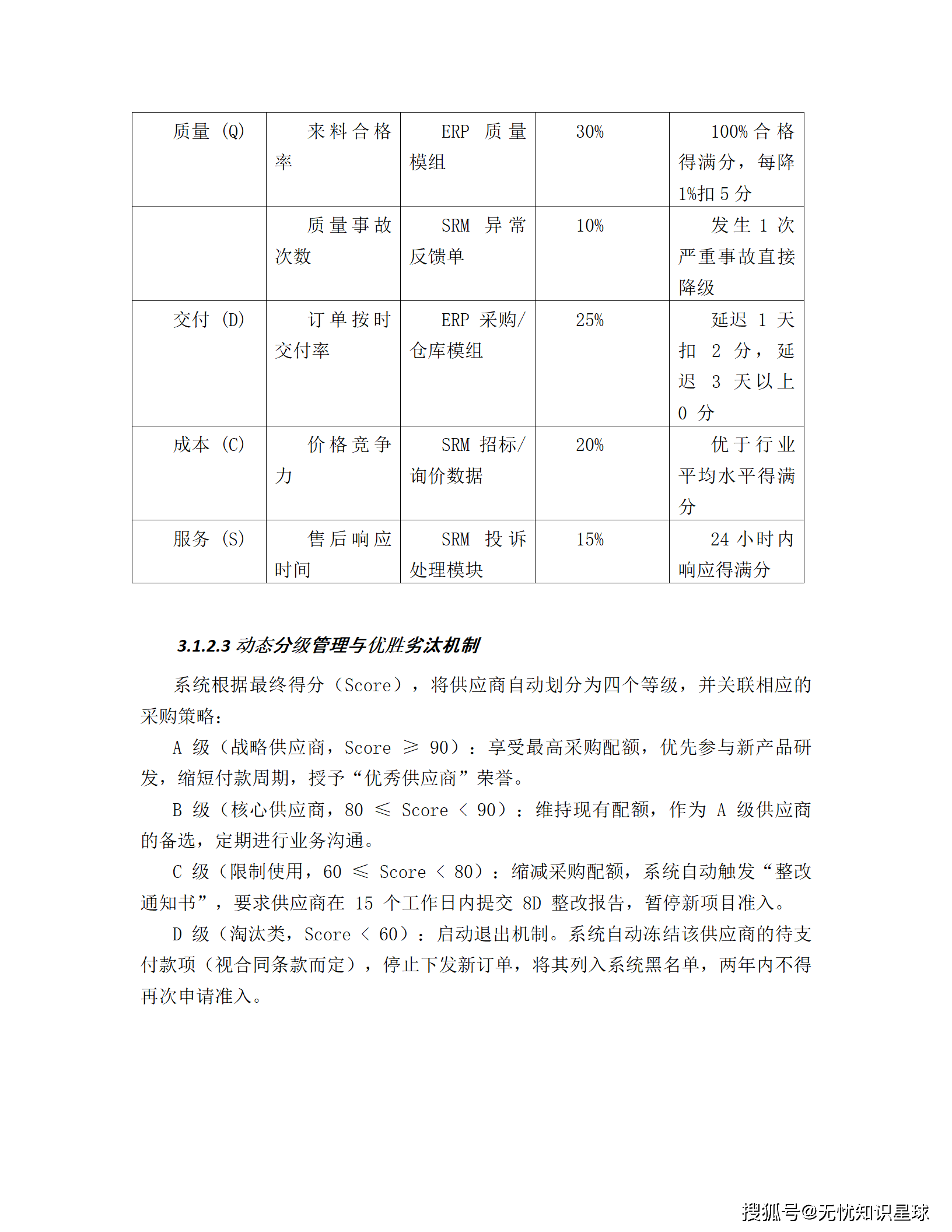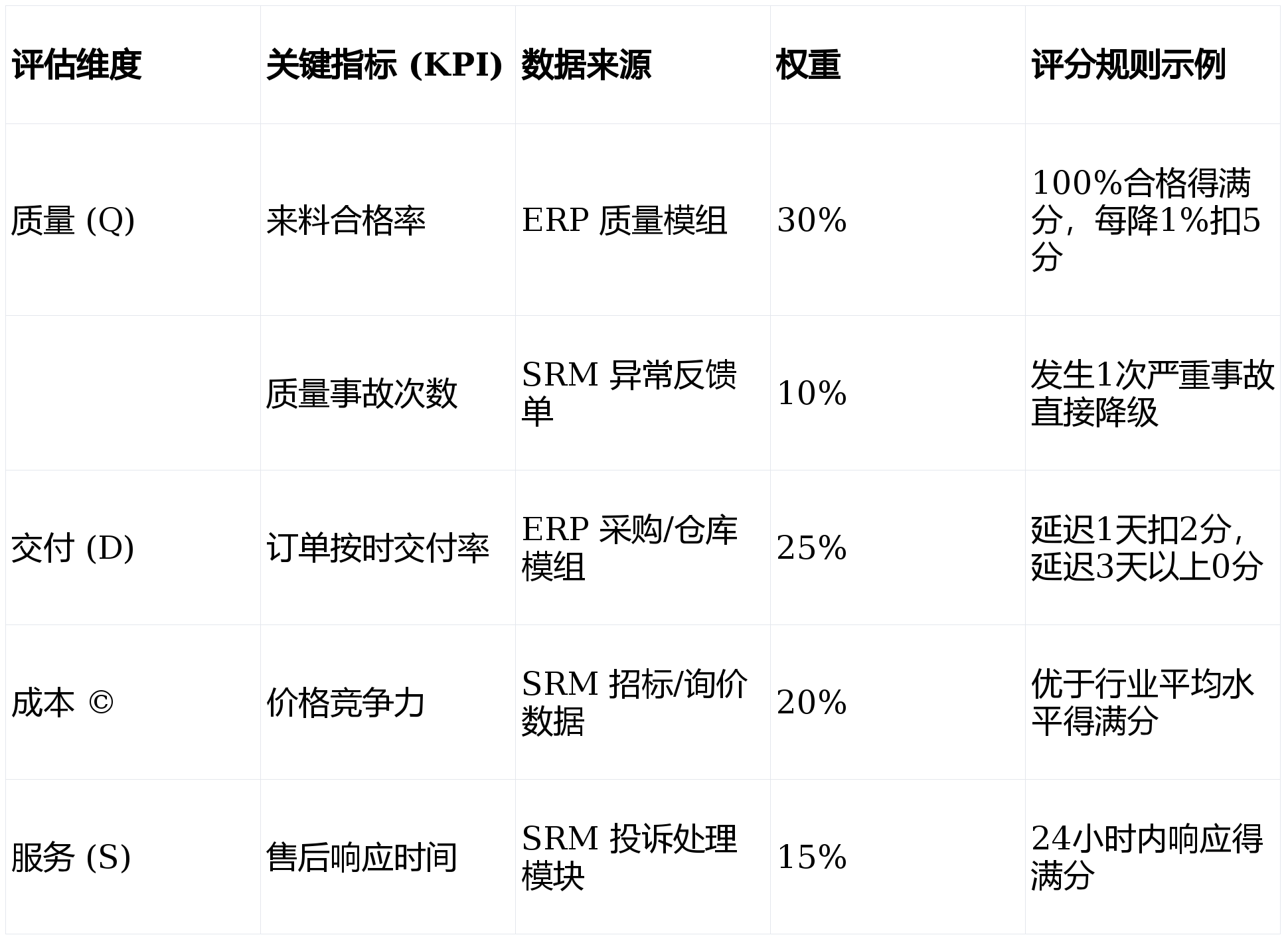 - A级(战略供应商,Score ≥ 90):享受最高采购配额,优先参与新产品研发,缩短付款周期