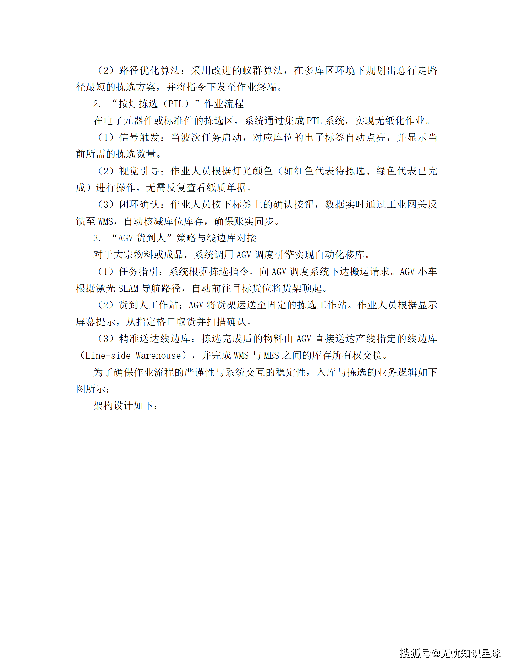 - 路径优化算法:采用改进的蚁群算法,在多库区环境下规划出总行走路径最短的拣选方案