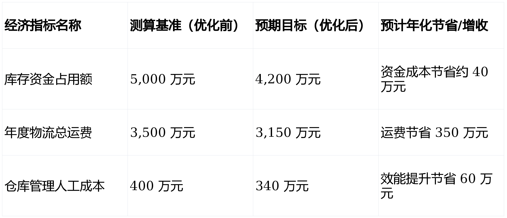 - 库存资金占用减少:基于大数据预测模型,库存周转率预计提升15%以上,每年可释放流动资金约800万元