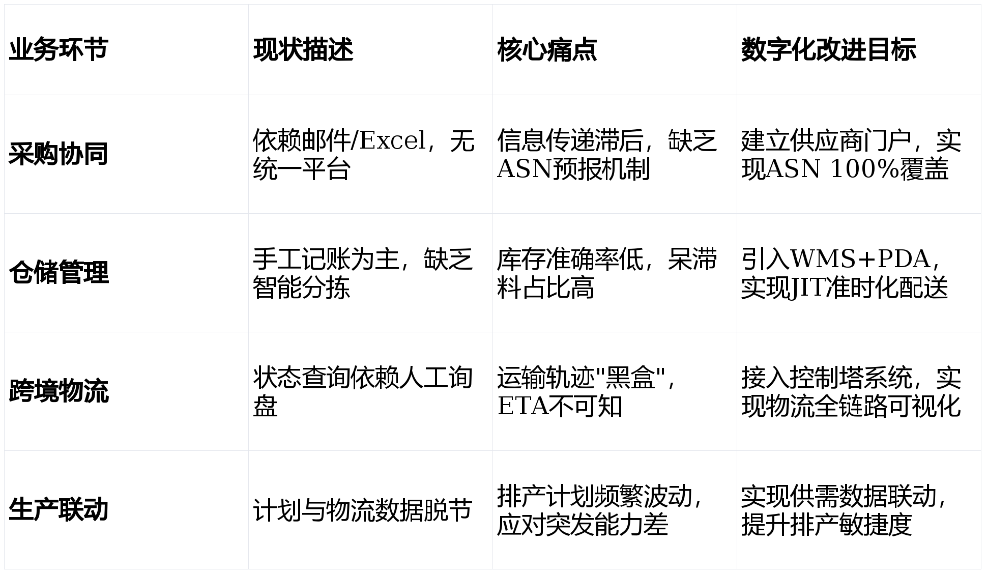 核心洞察:通过数字化平台的建设,将实现底层数据的互联互通,打破各部门间的"信息孤岛",实现从采购、仓储到物流的全链路透明化管理,从而在复杂多变的全球环境下,提升企业的核心竞争力和抗风险能力。