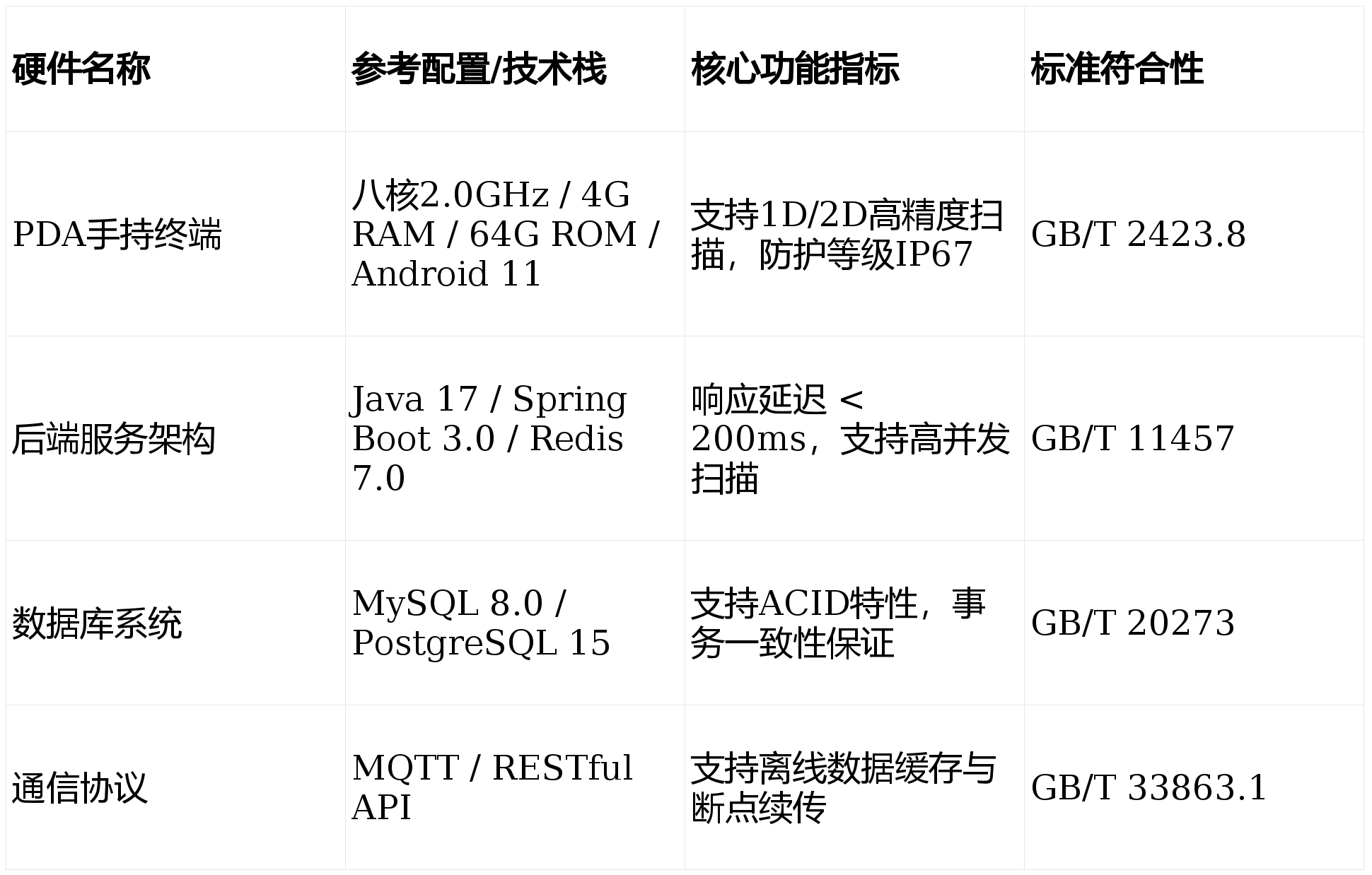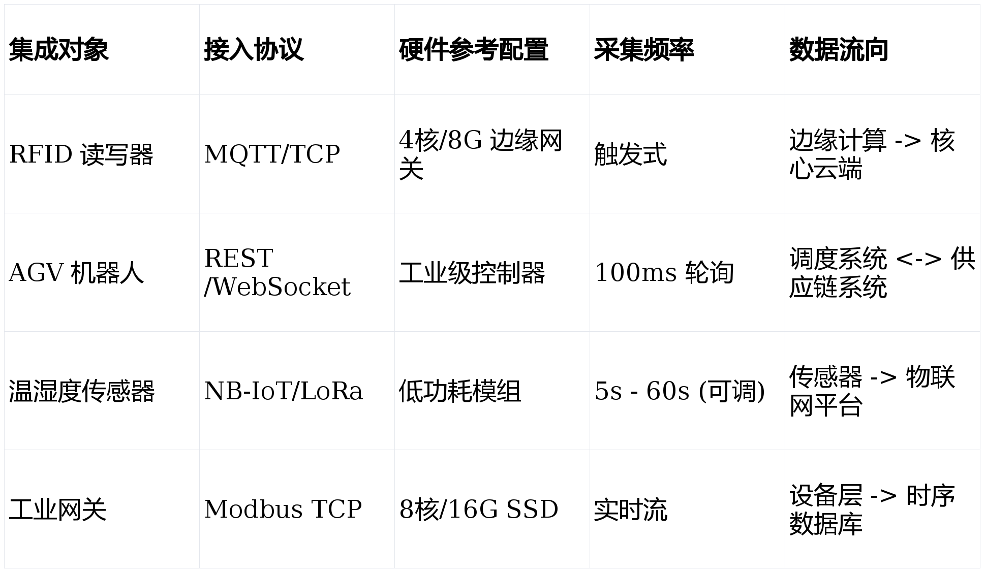 - 智能化硬件集成:AGV集成、RFID应用(902-928MHz频段,读取距离不低于5米)