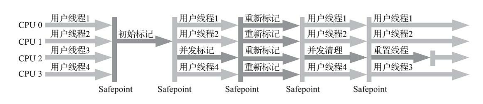 其中初始标记、重新标记这两个步骤仍然需要"Stop The World"。初始标记仅仅只是标记一下 GC Roots 能直接关联到的对象,速度很快;并发标记阶段就是从GC Roots的直接关联对象开始遍历整个对象图的过程,这个过程耗时较长但是不需要停顿用户线程,可以与垃圾收集线程一起并发运行;而重 新标记阶段则是为了修正并发标记期间,因用户程序继续运作而导致标记产生变动的那一部分对象的标记记录,这个阶段的停顿时间通常会比初始标记阶段稍长一 些,但也远比并发标记阶段的时间短;最后是并发清除阶段,清理删除掉标记阶段判断的已经死亡的 对象,由于不需要移动存活对象,所以这个阶段也是可以与用户线程同时并发的。