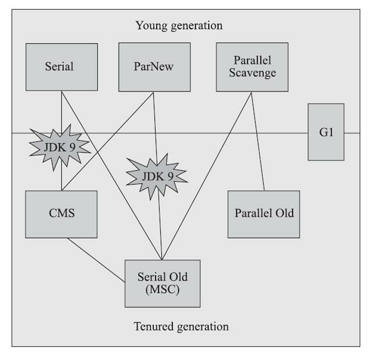 JDK 9 之后,(Serial,CMS) 以及(ParNew,Serial Old)的组合已经被废弃了,默认收集器也变成了 G1。