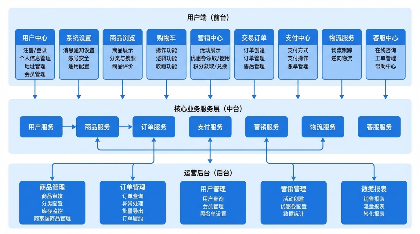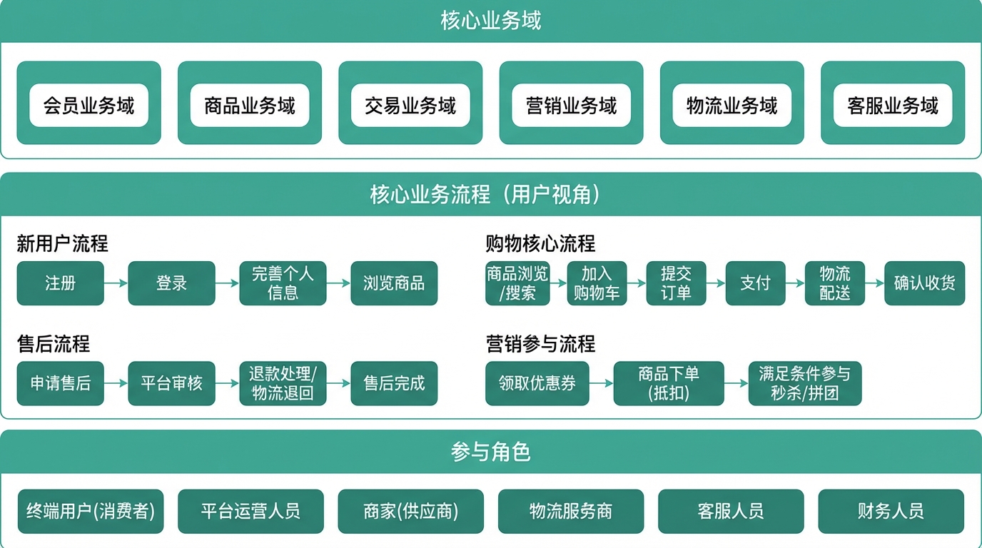 - 业务架构图:聚焦用户要做什么,呈现核心业务流程和模块(如电商产品的商品浏览、下单、支付、物流等模块)