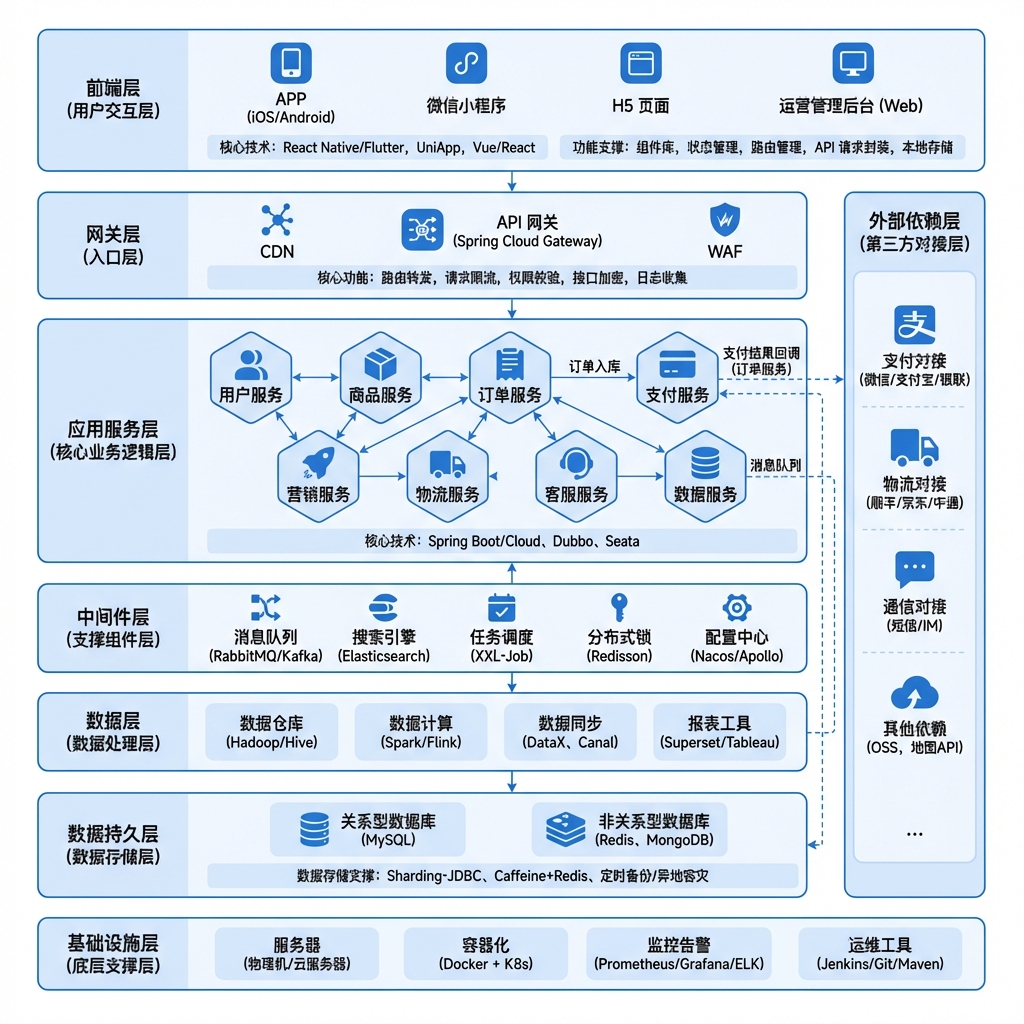 - 技术架构图:聚焦技术怎么实现(研发角度),包含服务器、数据库、中间件、接口等