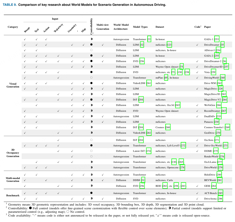 1 几何表示指3D几何表示,包括:3D体素占用、3D边界框、3D深度、3D分割和3D点云。 2 满圆可控性:完全控制(模型提供精细场景定制,并对场景元素具有灵活控制);半圆部分控制(模型支持有限或参数化控制,例如调整地图);不可控制。 3 代码可用性:"-"表示代码在论文中未宣布发布或尚未完全发布;"✓"表示代码已开源发布。
